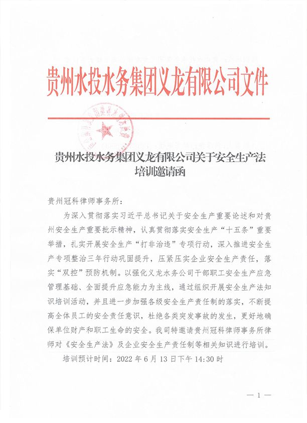 贵州水投水务集团义龙有限公司关安全生产法培训邀请函