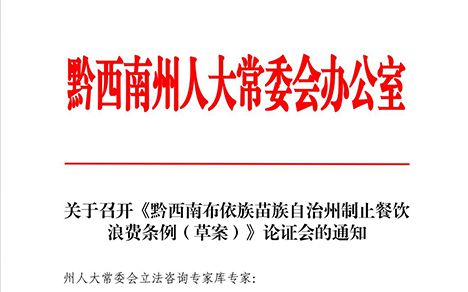 州人大常委会立法咨询专家库专家: 为推进《黔西南布依族苗族自治州制止餐饮浪费条例(草 案)》立法工作,提高立法的科学性、民主性和可操作性,根据 工作安排,拟召开《黔西南布依族苗族自治州制正餐饮浪...
