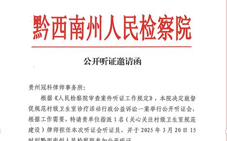 贵州冠科律师事务所: 根据《人民检察院审查案件听证工作规定》,本院决定就督促规范村级卫生室诊疗活动行政公益诉讼一案举行公开听证会,根据工作需要,特请贵单位指派1名(关心关注村级卫生室规范建设)律师担...