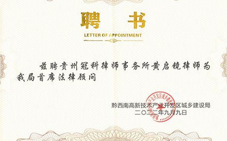 黔西南高新技术产业开发区城乡建设局聘我所黄启镜律师为首席法律顾问