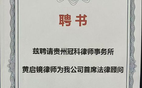 兹聘请贵州冠科律师事务所 黄启镜律师为我公司首席法律顾问